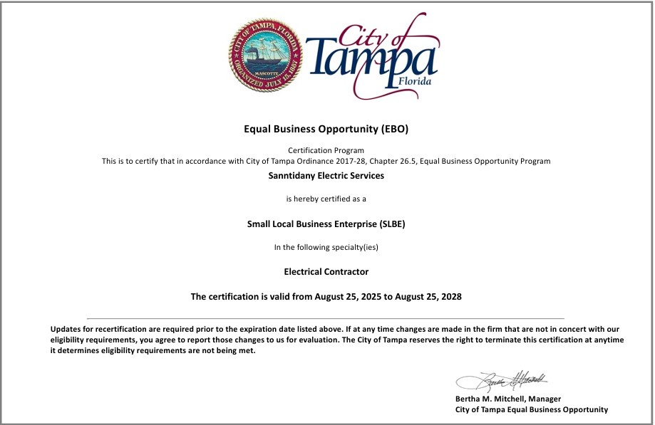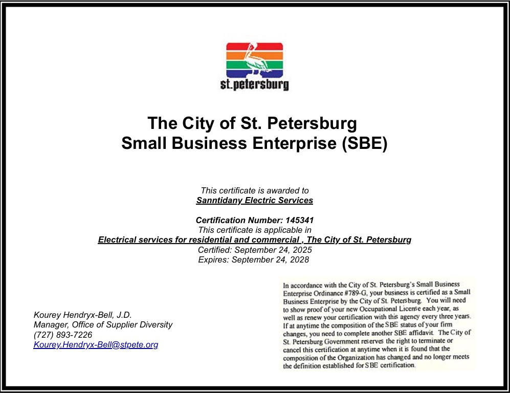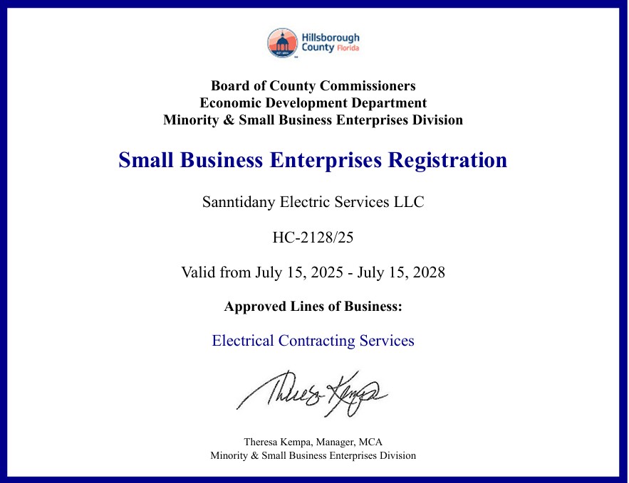 Sanntidany Electric Services LLC is a licensed and insured electrical contracting company proudly serving communities across Florida.